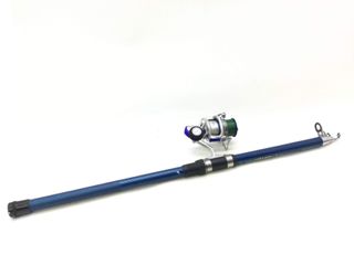 Caña de pescar telescópica de color plateado y azul. - Mango de goma. - Anillas de metal. - Diseño de varias secciones.