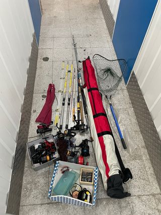 SE VENDE POR MUDANZA ESCUCHO OFERTAS Conjunto de material de pesca que incluye cañas y carretes. - Varias cañas de pescar de diferentes tamaños. - Múltiples carretes de pesca. - Red de pesca. - Bolsa de transporte para cañas.
