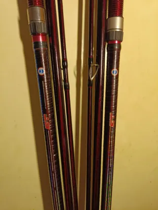 Conjunto de cañas de pescar de alta gama para surfcasting. Diseñadas para ofrecer un rendimiento superior en la pesca. - Diseño en color rojo oscuro con detalles brillantes. - Incluyen anillas y portacarretes metálicos. - Cada caña presenta un logo circular distintivo.