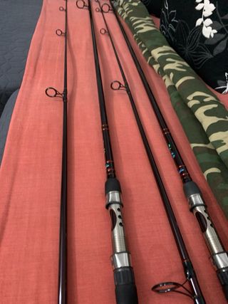 2 Cañas de pescar ,Mclass 12FT , 3LBS para Carpfishing ... - 2 Fundas en color verde camuflaje - 2 Fundas portacarretes Starbite 12Ft XL - Sin arrañazos o rosaduras....