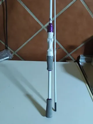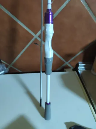 Caña de pescar Sougayilang para spinning, con una longitud de 1.80 metros. Ideal para tus salidas de pesca. - Diseño en color blanco y detalles en morado. - Empuñadura ergonómica en color gris.