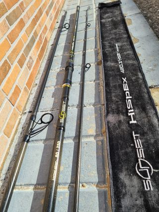 caña de surfcasting sunset hispex HSE hibrid es una de las cañas más ligeras del mercado, pesa sólo 410g y tiene 22milimetros de diametro, toda entera montada en FUJI anillas en K y porta carretes FUJI tiene acción de 80 a 250g pescar surfcasting spining pinchos pesca picas surfcastin carrete shimano daiwa okuma kali kunan vercelly sunset híbrido surcasting