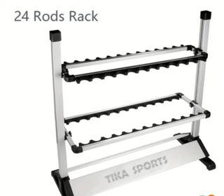 Soporte para 24 cañas de pesca, modelo Tika Sports. Ideal para organizar tu equipo. - Capacidad para 24 cañas. - Estructura de aluminio. - Diseño de dos niveles. Esta montado, nunca se ha utilizado.