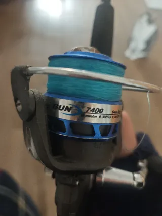 Se vende caña de pescar con carrete. Tiene algunos desperfectos y requiere algun arreglo. Los tramos estan pegados por lo cual no se puede plegar. - Carrete modelo GUN 7400. - Hilo de color azul.