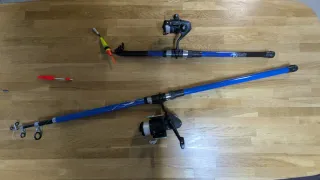 Lote de cañas de pescar (Evia, Kali, Daiwa) – Buen estado. Material ligero y resistente. Ideal para pescadores o coleccionistas. Se venden juntas o por separado 🔹 1 caña Evia Serie Azul de 2,40 m con carrete Mitchell 🔹 1 caña Kali Delfín de 1,65 m con carrete Sagarra modelo 51 🔹 2 cañas Daiwa de 2,10 con carrete Daiwa modelo 7270 A