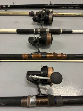 Lote de material de pesca que incluye varias cañas y una valla para cangrejos. Está vendida la primera de la izquierda de color negro y el carrete azul.. el resto está todo. - Variedad de cañas de pescar. - Valla de malla para la captura de cangrejos.