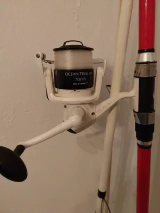 Conjunto de caña de pescar y carrete de la marca Sunset. - Caña de pescar modelo OCEAN TRAIL SW 701FD. - Carrete con 1 rodamiento a bolas.