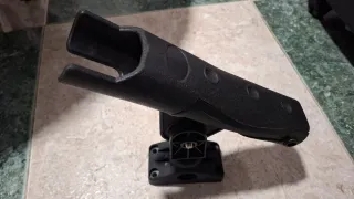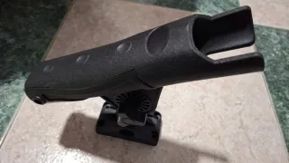 Soporte para caña de pescar diseñado para kayaks. Fabricado en plástico negro resistente. - Base giratoria. - Diseño abierto para fácil acceso a la caña.