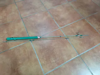 Se vende caña de pescar de 1.80 metros de largo, junto con un carrete y varios accesorios para la pesca. - Caña de pescar de color verde. - Carrete de pesca a juego. - Bolsa de transporte incluida. - Set de accesorios de pesca.