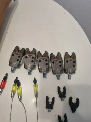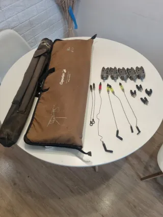 Conjunto de accesorios para pesca. - Funda para cañas de pescar. - Soporte para cañas (rod pod). - 6 x alarmas de picada. - 3 x colgadores de línea (swinger). - 3 x indicadores de picada (hangers). Información x privado