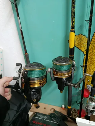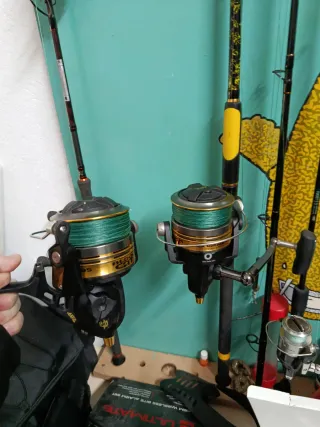 Dos carretes de pesca de la marca Black Cat. Carretes muchísima capacidad:500m 0'45 Cargados de 400 metros de 0'55 black cat Carretes nuevos nunca usados. Precio combo 350 Caña Xh-s 3m hasta 600 g de lance. Usada 3 veces Precio80 2 picas soldadas a mano estilo black cat pensadas para breack line con el hierro trasero. Usadas 2 veces Precio 40 Todo junto 450, separado 470 - Modelo Big Cat. - Color negro y dorado. - Bobinas con hilo verde.