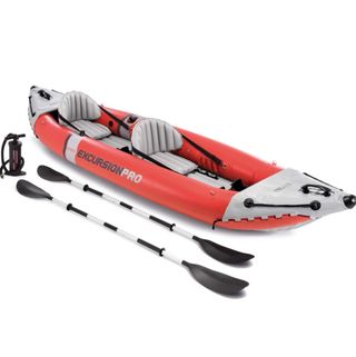 Kayak hinchable Intex excursion pro, medidas 384x94x 46 cm, capacidad para 2 personas, peso máximo que soporta: 180 kg Vinilo resistente de 3 capas y 0,75 mm de grosor, el kayak es de color naranja intenso con gráficos deportivos Tiene 2 asientos hinchables regulables, 2 quillas, 2 huecos para caña de pescar, 2 apoyos para los pies, espacio de almacenaje y asas en proa y popa