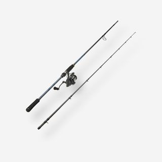 Pack completo para pesca que incluye una caña, un carrete y un sedal. - Caña de pescar negra. - Carrete de pesca plateado. - Sedal Tai Ko, 0.25mm, 10kg.