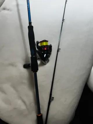 Equipo completo para la pesca de calamar o choco. Nuevo a estrenar. Caña Spinning 2,10 mt. Acción: 7/30 gr Secciones: 5 Tramos Fibra de carbono T30 Anillo guía Fuji Peso: 136 gr Carrete: series 2000 Arrastre máx 8 kg Relación 5.0:1 Hilo Trenado 0,23 mm ( 12,7 kg ) 200 metros, ya montados en el carrete. Bajo de línea Fluoro carbono 0,40 mm ( 13,8 kg ) 120 metros. Conectores ( 6#, 25 mm, 18 kg ) x 50 unidades. Emerillón ( 6# , 12 mm, 28 kg ) x 50 unidades. Poteras : 5 unidades * 2,5# 12 gramos 100 mm x 1 * 3,5# 21 gramos 135 mm x 1 * 2,0# 7,3 gramos 85 mm x 1 * 2.0# 7,6 gramos 80 mm x 1 * 3,5# 30 gramos 135 mm x 1