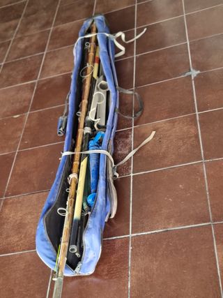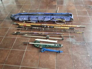 Juego de piezas de cañas de pescar - Incluye 1 caña de bambú. - 6 palos difentes de diversos materiales. - 3 anclajes - 1 red con palo telescópico - 1 bolsa Está todo muy usado y la bolsa está rota pero hace el apaño. Se vende todo el lote por el precio indicado