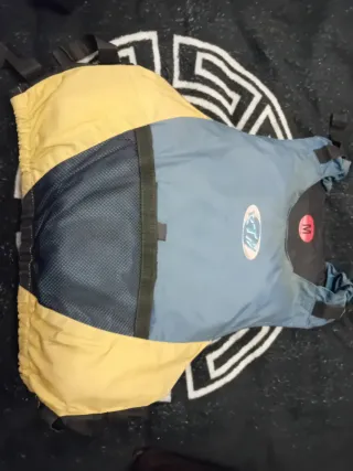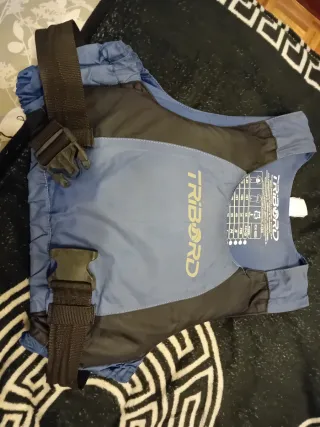 Chaleco de seguridad TRI-BOARD en talla M de mujer/niño, talla S hombre, diseñado para actividades acuáticas. - Color azul y negro. - Cierre con hebilla y correa ajustable. - Logo de la marca visible. Otro chaleco azul y amarillo RTM. 10€ cada chaleco, 18€ los 2. Recoger en Pozuelo de Alarcon