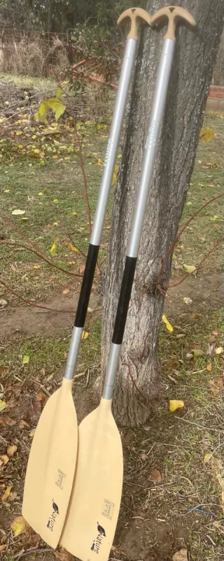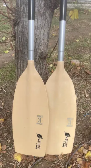Se venden dos remos de aluminio con palas de plástico color beige. Son ideales para kayak o canoa. - Remos de aluminio. - Palas de plástico color beige. - Marca: Nature by Gath. - Incluye un logo H en cada pala.