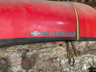 Canoa Old Town modelo Discovery 158 en color rojo. Fabricada por Old Town Canoe Co. en Maine, EE. UU. Des de que de compro hace ya más de 25 años, no se le ha dado uso y ha estado guardada en casa. - Modelo: Discovery 158 - Color: Rojo - Fabricante: Old Town Canoe Co.
