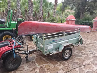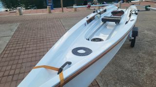 Canoa de remo deportivo en fibra de vidrio para uno o dos remeros, incluye dos juegos de remos, asientos y accesorios. Incluido tambien remolque de carretera nuevo y carro de botadura. - Diseño elegante y ligero. - Construcción robusta para mayor durabilidad. - Equipada con asientos cómodos.