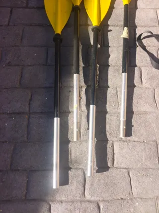 Conjunto de cuatro remos o palas para canoa o kayak. - Color amarillo brillante. - Ejes de metal con empuñaduras negras. - Parte de la pala de plástico resistente.