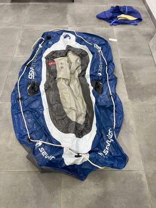 Canoa hinchable de color azul, marca Sevylor, con asiento y bolsa de red. - Incluye remo. - 2 Chalecos Salvavidas. El elástico de la cintura está pasadito pero cumplen su funcion, incluye llenador y bolsa estanca. El saco de transporte se me está apulgarandonen el garaje de ahí de venderla barata