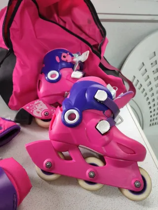 Set de patines en línea ajustables, ideales para iniciarse en el patinaje. El color rosa y morado los hace muy llamativos. - Tallas ajustables: 26, 27 y 28. - Incluye protecciones para muñecas, codos y rodillas. - Bolsa para transporte.