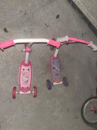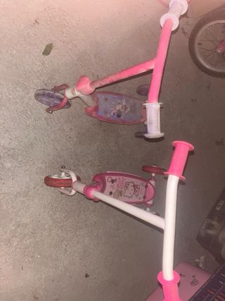 Dos patinetes infantiles de tres ruedas, uno con diseño de Hello Kitty y otro con diseño de Minnie Mouse. Ideales para los más pequeños. - Patinete rosa con Hello Kitty. - Patinete morado con Minnie Mouse. - Manillar ajustable y puños de goma. - Ruedas de plástico. Precio por unidad