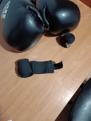 Par de guantes de boxeo Adidas en color negro + cintas para mano, tamaño 10oz. Ideales para entrenamiento. Usados solo una vez - Marca: Adidas - Tamaño: 10oz - Color: Negro
