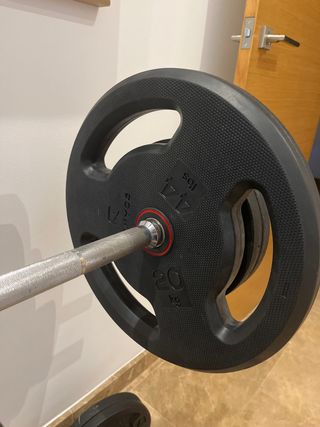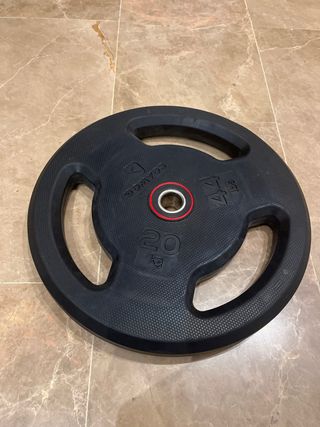 Disco de pesa de caucho con un peso de 20 kg. Ideal para equipar tu gimnasio en casa sin dañar el suelo. Muy cómodas de agarrar y trabajar con ellas. Está en perfecto estado. - Material: Caucho. - Peso: 20 kg. - Diámetro del agujero: 28 mm.