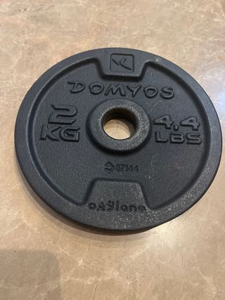 Disco de pesa de la marca DOMYOS con un peso de 2 kg. - Peso: 2 kg (4.4 LBS). - Material: Hierro fundido. - Diámetro agujero: 28 mm Dispongo de 8 discos de 2kg.