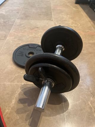 Conjunto de pesas y mancuernas para entrenamiento. - Discos de diferentes pesos. - Mancuernas con discos. - Alfombrilla protectora incluida -5discps10kg -8_5kg -10_1kg -10_2kg -8-0'5kg Banco de pesas .