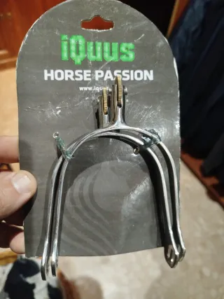 Lote de tres pares de espuelas de la marca iQuus. - Diseño metálico plateado. - Detalle de rodaja dorada. - Modelo Horse Passion.