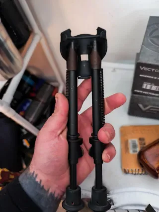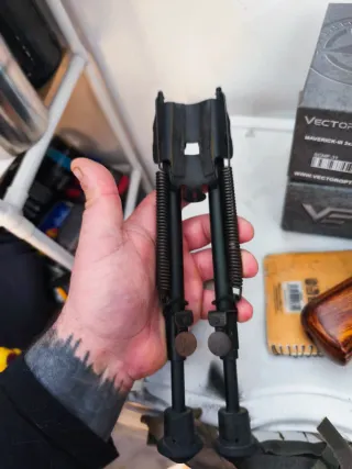 Bípode táctico para airsoft, diseñado para ofrecer estabilidad. - Construcción robusta. - Patas ajustables en altura. - Mecanismo de resorte para despliegue rápido.