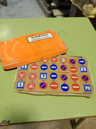 Juego de dominó con fichas de madera que representan señales de tráfico, caja original de cartón. Muy antiguo - Fichas de madera. - Diseños de señales de tráfico.