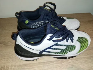 Zapatillas de pádel Bullpadel HACK en color blanco, azul marino y verde lima. - Diseño moderno y deportivo. - Cierre con cordones. - Logo de la marca visible.