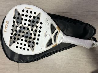 Con solo 2 partidas esta Pala de pádel Nox AT10 Genius 12K, modelo de Agustín Tapia. Diseñada con un acabado blanco y detalles en dorado y negro. - Marco con acabado en blanco y detalles dorados. - Superficie con patrón de agujeros característico. - Empuñadura blanca con cinta. - Incluye funda protectora negra.