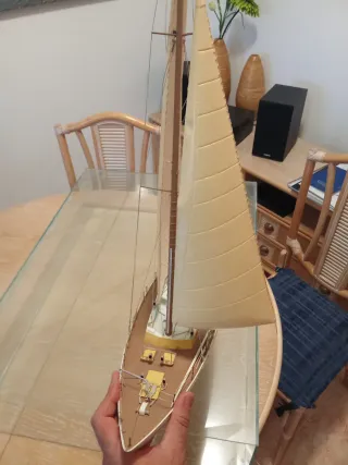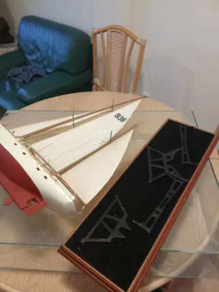 Maqueta de velero detallada, presentada en una urna protectora. Para restaurar. - Casco blanco y rojo. - Velas de plástico con número de registro. - Base de plástico con soporte para piezas.