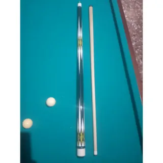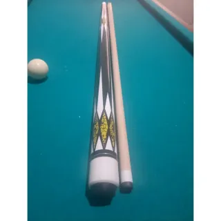 Taco de billar americano con un diseño llamativo. - Mango con diseño de rombos amarillos y negros. - Parte inferior blanca con detalles negros.