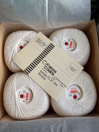 Dos ovillos de hilo de algodón Tridalia Super. - Ovillos de algodón. - Grosor N8. - Peso de 200 gramos cada uno. - Color blanco roto sólido. -Caja de 4 unidades mas 2 sueltos vendo los 6 por 30€ - Fabricado por Fabra y Coats en Barcelona.