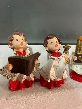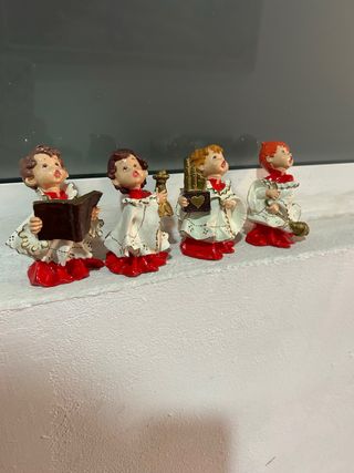 Conjunto de cuatro figuras de monaguillos de resina. - Figuras decorativas con vestimenta blanca y detalles rojos. - Cada figura sostiene un objeto relacionado con la música o la lectura.