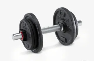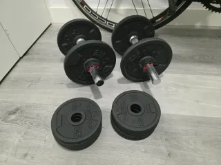 Set de mancuernas ajustables para entrenamiento en casa. Incluye barra, discos y cierres. - Discos de peso. - Barra con agarre texturizado. - Cierres de seguridad para los discos.