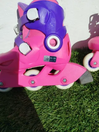 Patines en línea de color rosa y morado, ideales para iniciarse en el patinaje. - Talla ajustable 26-28. - Cierre con velcro y hebilla. - Ruedas de 64mm. - rodilleras y cubre manos incluidas