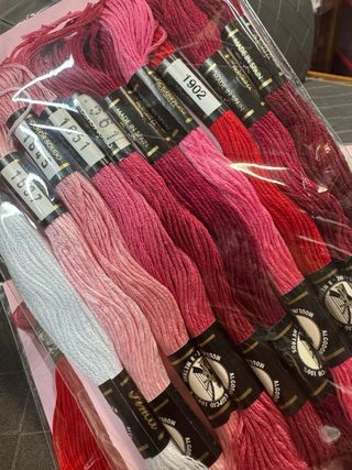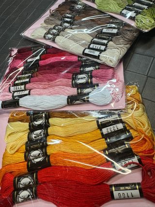 Lote de 10 madejas de hilo de bordar de la marca Finca. Los hilos son de varios cabos y presentan una gama de colores variada. - Marca: Finca - Cantidad: 10 madejas - Material: Hilo de varios cabos - Colores: Surtidos