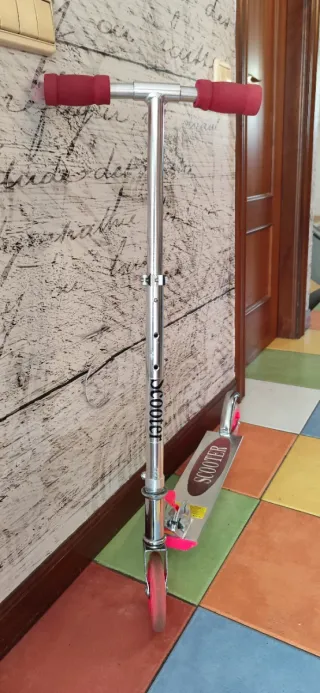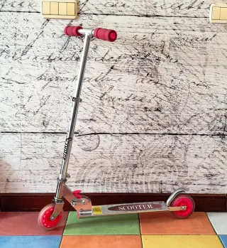 Patinete plegable ligero y resistente, para niños o niñas. Con freno en la rueda trasera, y superficie rugosa en la planta, para mejor agarre. Manillar regulable en altura. Altura máxima de manillar: 85 cm. Ancho de huella: 33 cm. Peso: 2 kg Buen estado, con las marcas de uso que se ven en las fotos.