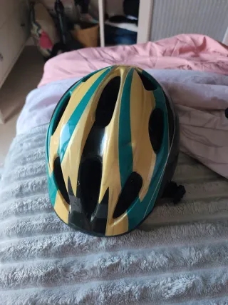 Casco de bicicleta con un diseño llamativo en varios colores. - Diseño con franjas amarillas y turquesas. - Base negra. - Múltiples ventilaciones.