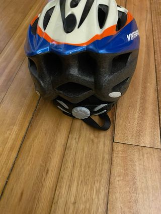 Casco de bicicleta para niños talla S color azul y blanco. Incorpora luz trasera con botón de encendido y apagado (luz continua o intermitente). Poco uso (como nuevo).