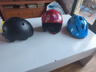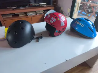 Lote de cascos para disfrutar de la nieve y la bicicleta de forma segura. Son ideales para actividades al aire libre. - Casco rojo con dibujos infantiles. - Casco negro. - Casco negro mate. - Casco negro con ventilación. - Casco azul con ventilación. 4€ cada uno