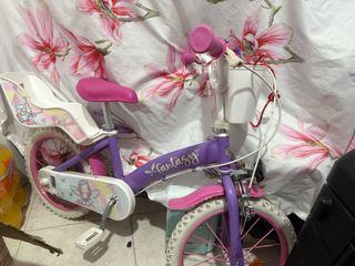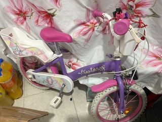 Bicicleta infantil de color morado con detalles en rosa y blanco. Ideal para las primeras aventuras. ( REGALO CASCO) - Asiento trasero para muñecas. - Cesta delantera. - Diseño con hada y mariposas.