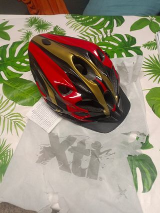 Casco para bicicleta en buen estado. Ideal para protegerte durante tus paseos en bici. - Color rojo y dorado. - Talla única (ajustable). - Diseño deportivo.