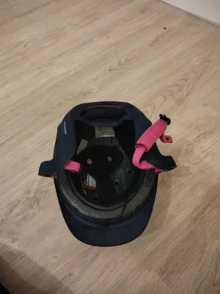 Casco de hípica de la marca Fouganza, diseñado para niños. Usado muy pocas veces. - Color azul marino y rosa fuxia. - Talla S, 52-55 cm. - Diseño con ventilación superior.